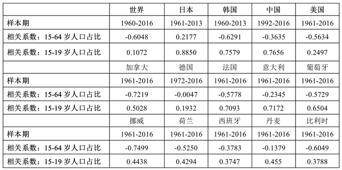 表1 人口年龄结构和经济增长相关关系汇总表 数据来源:世界银行网站公布