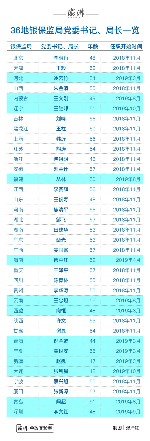 同月,48岁的重庆银监局副巡视员向恒升任西藏银保监局党委书记、局长,47岁的青海银保监局党委书记、局长赵巍调任新疆银保监局党委书记、局长,时任陕西银保监局副局长倪金乾升任青海银保监局党委书记、局长。倪金乾现年44岁,是目前36位地方银保监局局长中最年轻的一位。