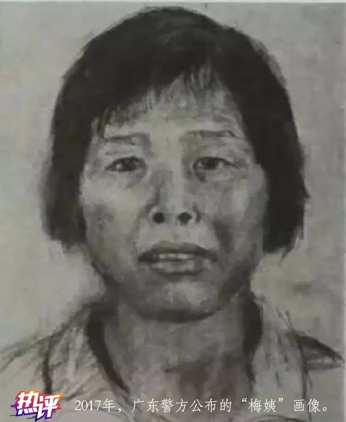 2017年6月,广州增城警方发布了一则征集线索的公告称,“梅姨”真实姓名不详,现约65岁,身高1.5米,讲粤语,会客家话,曾长期在增城、韶关新丰等地区活动,涉嫌多起拐卖案件。警方在公告中还贴出了一张“梅姨”的模拟画像,这是“第一张画像”。