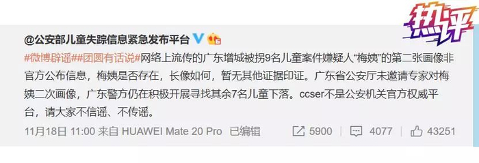 警方称,除广东外,近期湖南、四川、福建乃至新疆等地均有人举报称“梅姨”在当地出现,后经复核,均不符合案犯描述的“梅姨”身高、年龄、语言等综合特征。