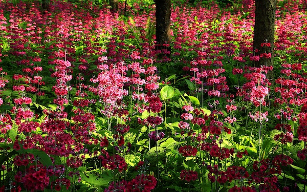 大瓦山顶是一个平坦的略有起伏的台地,面积约1.6平方公里,杜鹃花铺天盖地,几乎把整个台地都覆盖了,许多杜鹃树高近十米,直径粗大。在杜鹃树之下,苔藓肆意生长,编织成一张漂亮的地毯,杜鹃花之间的空地上长着一些秋牡丹和樱草。许多地段,飘着缤纷花瓣的溪水漫过小路,行人只好踏着溪边的树根谨慎前行。时值六月,我看到在山下盛开在三四月间的报春花,在瓦山坪以上区域仍然怒放。
