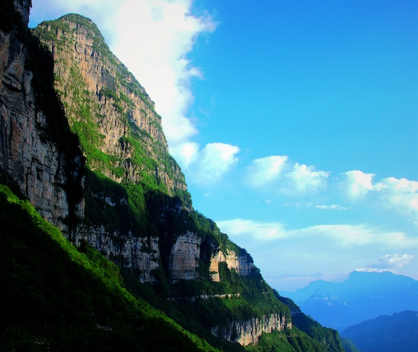 在瓦山坪以上,正如向导所说,所谓的路,是顺着崖壁上的石缝搭起的木梯。由瓦山坪上行攀上莲花崖后,是一长段窄窄的山脊,名唤滚龙岗,也就是当年威尔逊差点被猎犬拽下深渊处。此处地形和“自古华山一条路”相比,其险峻陡峭有过之而无不及。
