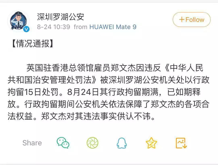 警方回应说,2019年8月9日,英国驻香港总领事馆雇员郑文杰因违反《中华人民共和国治安管理处罚法》第六十六条规定,被深圳罗湖警方处以行政拘留15日的处罚,其对嫖娼的违法事实供认不讳。8月24日,其行政拘留期满被释放。行政拘留期间,公安机关依法保障了郑文杰的各项合法权益。