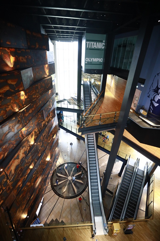 纪念馆上午10点营业,10月2日这天提前到9点让我们进去拍摄。它气象不凡,其设计理念是将水晶、冰山、五角星(船东白星公司的logo)和泰坦尼克号船头的形象汇为一体,外观如启航的船头又如耸立的冰山,内部楼层结构则模仿泰坦尼克号的甲板,中庭的高度跨越五层楼,逼真地展示出当年巨轮庞大的机房的空间。