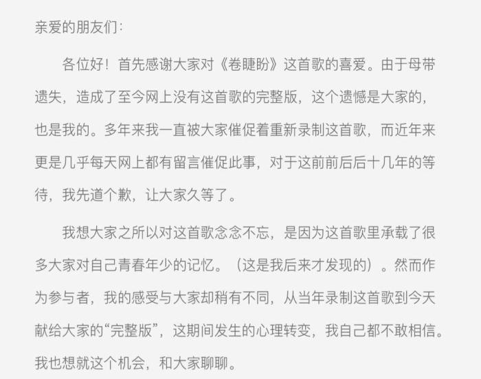 完整版《卷睫盼》上线的当天,重录计划的发起人、原唱之一的吴彤先生在微博上分享了与这首歌的缘分及多年来的心路历程。
