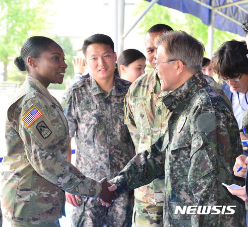 韩国总统文在寅与驻韩美军士兵握手(纽西斯通讯社)