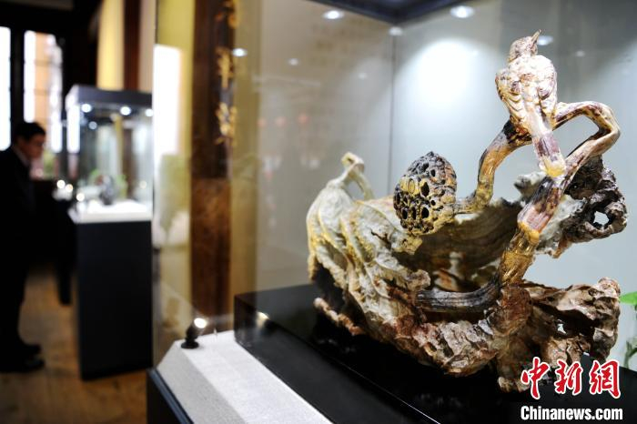 图为寿山石雕作品《独立秋塘》。寿山石雕是福建福州地方传统美术,是国家级非物质文化遗产之一。 张斌 摄