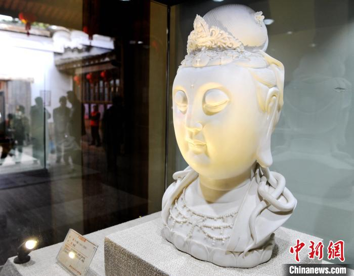 图为展示的福建德化陶瓷作品《大观音头像》。德化县地处福建省中部,与江西景德镇、湖南醴陵并称中国三大近代瓷都,是中国陶瓷文化的发祥地之一。 张斌 摄