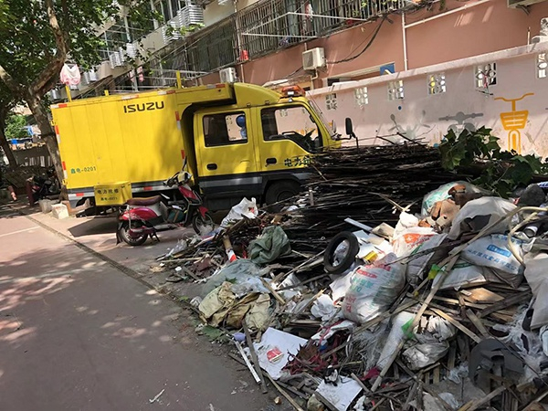 在改造工程做好大概不到3个月,就来了市里二次供水的工程队,把路面挖开;紧接着又过了两个多月,精品小区的工程开始了,平坦的道路变成了方便的建筑材料堆场。阻车桩被拔起,停进了各种工程车,脚手架也搭起来了,非机动车只好又停回北侧的活动区里。随着工程的进行,222弄的垃圾越堆越多。