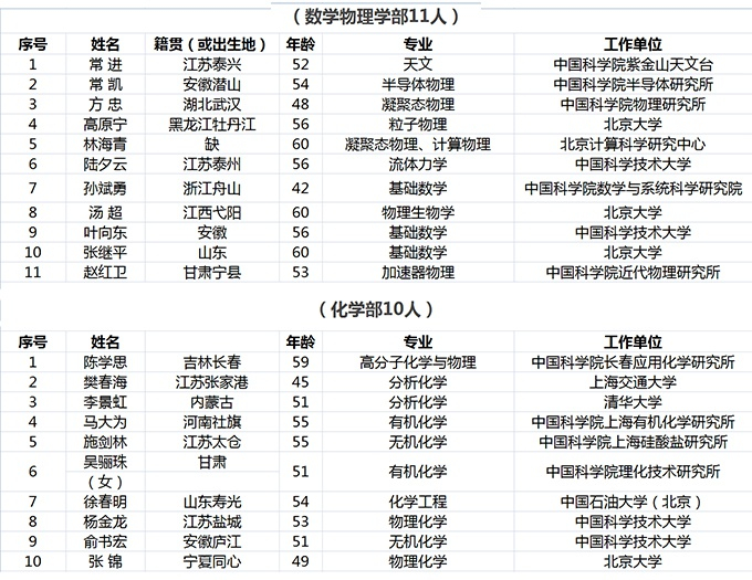 其中,数学物理学部11人,化学部10人,生命科学和医学学部10人,地学部11人,信息技术科学部7人,技术科学部15人。