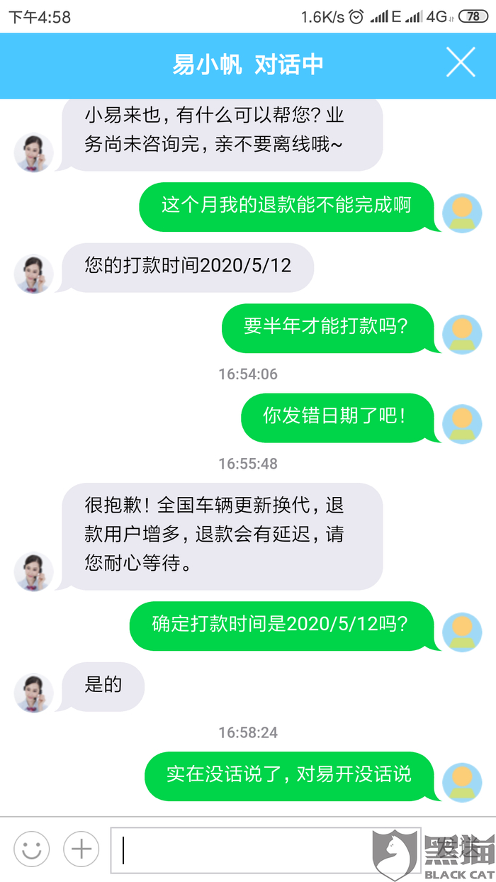 消费者“小鲤鱼的哥哥”在12月11日向黑猫投诉平台再次反映:“易开租车已经完全不顾租车用户的感受了,退款一直不退,再次问退款日期,本来20天的退款时间今天跟我说要2020年5月12,失望愤怒”