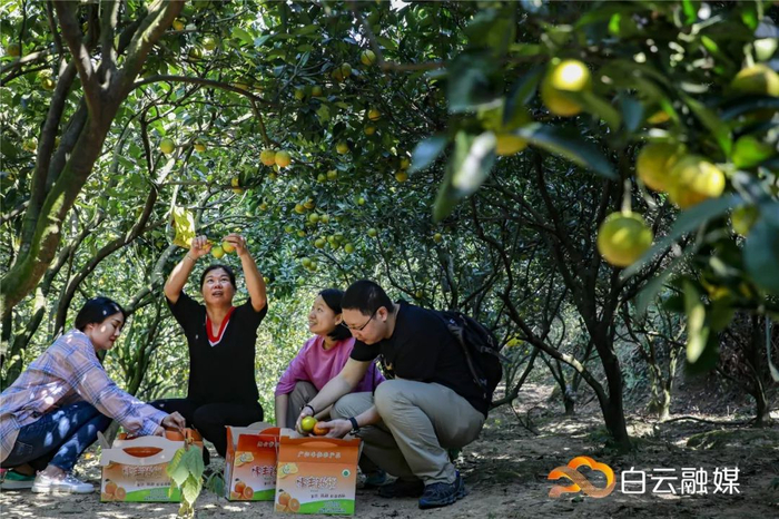 不少游客从天河、花都、佛山等周边地区慕名而来,他们一大早驱车自驾来到农庄,与亲朋好友结伴,或是三代同堂出游,体验采摘甜橙的乐趣。来自花都的梁伯表示,自己本身很喜欢吃甜橙,在农庄还吃到了橙汁蒸水蛋和甜橙焖鹅,感觉很新奇。