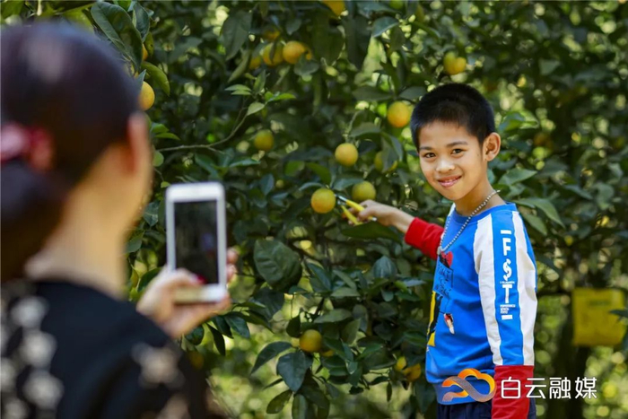 左手拿剪刀,右手提纸箱,在橙树下采摘或拍照,这便是帽丰甜橙农庄里的游客写照。