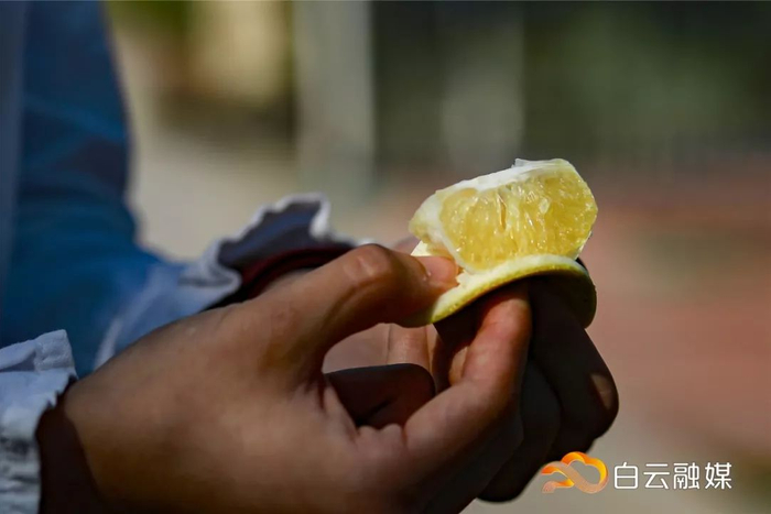 现场摘下一个甜橙,一刀切开汁水四溅,尝上一口,满满香甜,还带着淡淡特殊桂花香味!