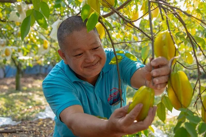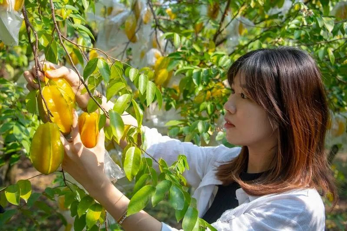 金灿灿的阳光透过果树投下一片片斑驳,一簇簇粉色小花开满枝头,一串串黄澄澄、水灵灵的杨桃压低了枝头。尽管果果被透明塑料袋包裹着,依然难掩诱人。摘下一个咬上一口,汁水充盈唇齿,满嘴秋日阳光的味道。