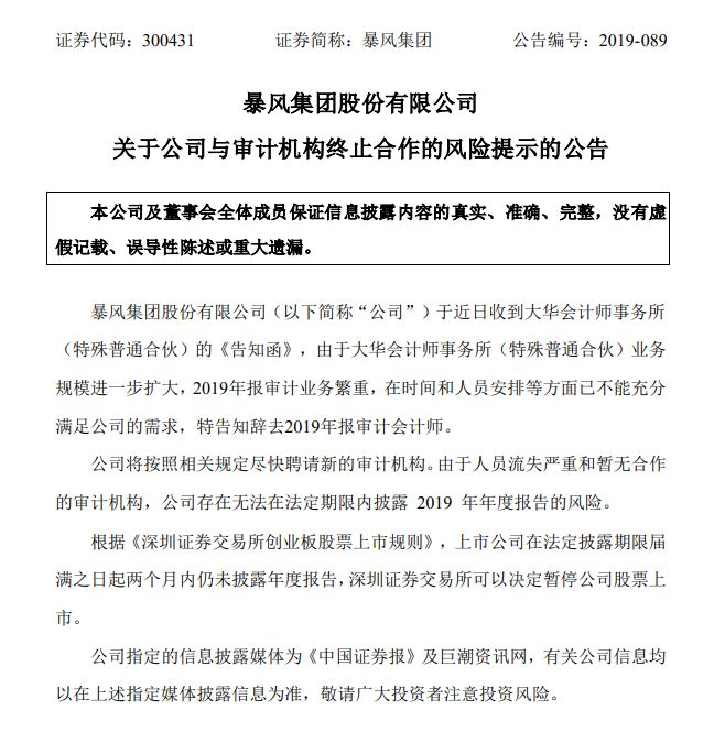 11月21日晚,暴风集团公告,公司于近日收到大华会计师事务所的《告知函》,由于大华会计师事务所(特殊普通合伙)业务规模进一步扩大,2019年报审计业务繁重,在时间和人员安排等方面已不能充分满足公司的需求,特告知辞去2019年报审计会计师。