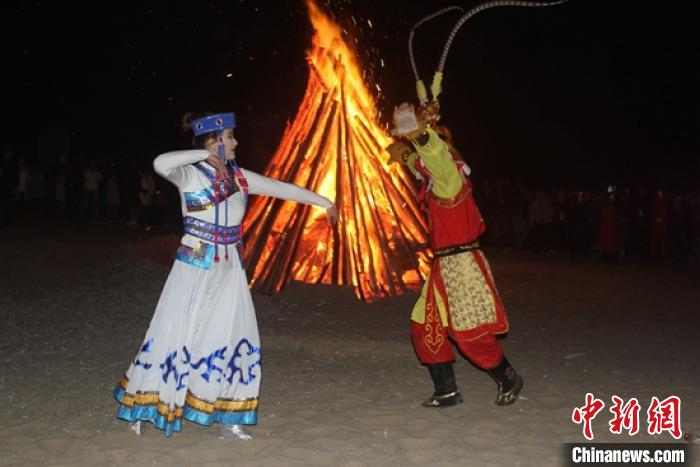 23日下午,新疆库车县冬春旅游宣传推介仪“奇遇沙世界?乐享古龟兹”首届沙世界文化旅游活动正式启动。演员在篝火晚会现场表演节目。 陶拴科 摄