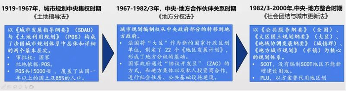 背景知识补充:上图这一现象,实际上展示出:巴黎在法国首位度非常高,这一点与北京之于中国的关系非常相似。实际上,法国的城市化仅仅经历了大约半个世纪的时间,就从一个传统的农业国发展到今天高城市化水平的工业化国家,其过程中的许多阶段与我国当前的快速城市化进程颇有相似之处,因此考察法国城市规划体系及其整体演变,对我国城市规划管理研究具有一定的启发意义。在法国城市规划演变期间,可以概括为中央集权时期、中央-地方合作伙伴关系时期和中央-地方整合时期三大阶段(如下图),支撑这一演变的是法规体系的不断完善和修正,这个问题更加庞大,该部分内容将在第四篇展开讨论。