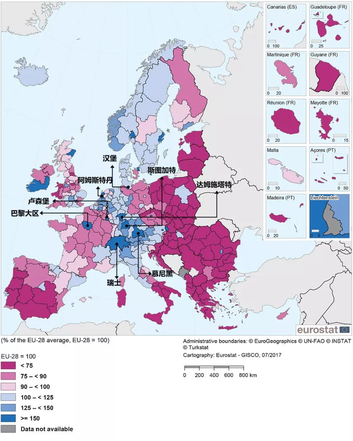 总之,在巴黎上班的人赚得不少,不上班的人又能获得形形色色的社会补助,加之房价比较理性、教育资源比较充沛,综合作用下带来了巴黎大区极强的家庭购买力(较高的可支配收入)。根据欧盟PPS购买力标准评价数据显示,巴黎大区是欧洲排名前五的一级行政区之一。从PPS购买力分析(图2)看,我们会发现在整个法国,首都巴黎城区的财富集中度相对较高,曾被描绘为“被贫困地区包围的岛屿”,这并不奇怪,在很多国家都适用,但德国刚好例外,有六个一级行政区的PPS评分均高于柏林。