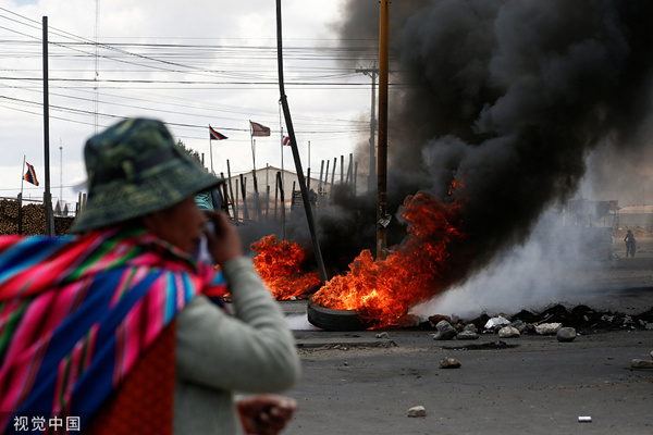 当地时间2019年11月19日,玻利维亚埃尔阿尔托,辞任总统埃沃·莫拉莱斯的支持者持续抗议。图片来源@视觉中国