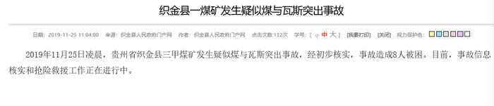织金县一煤矿发生疑似煤与瓦斯突出事故。 来源:织金县人民政府官网