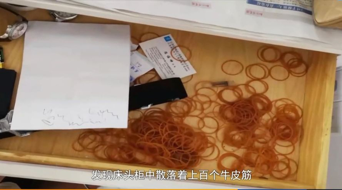 床头柜上散落着上百个牛皮筋