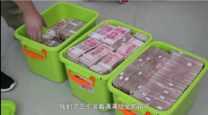 最终,办案人员在胡经纬妻子亲戚家的一个废弃水塔内,找到了三个装着满满现金的箱子。