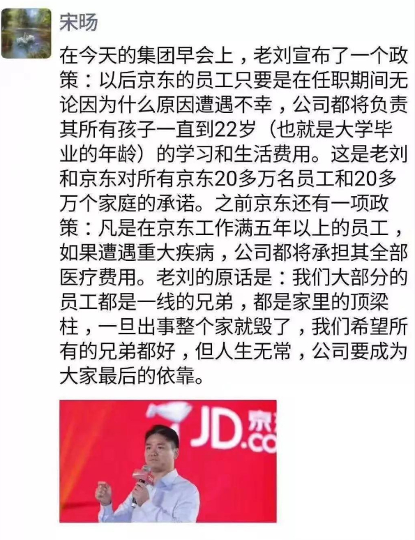据京东集团副总裁宋旸朋友圈发布的信息显示,25日,刘强东在集团早会上承诺,京东的员工只要是在任职期间无论因为什么原因遭遇不幸,公司都将负责其所有孩子一直到22岁(也就是大学毕业的年龄)的学习和生活费用。