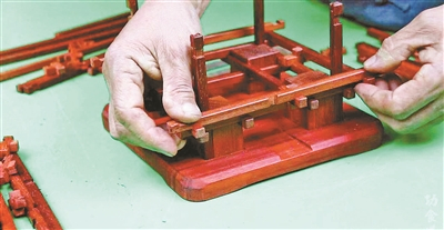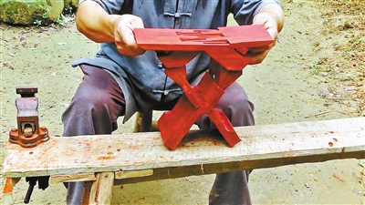 为了一次性制作成功,老爷子先在家里用纸盒做了一个鲁班凳的模型,熟练的操作让他有了信心,唯一面对的问题是木材的挑选,如果木头本身不行,一切的技术都是白费。“我最后选了一块非洲红木,坚固耐用,不容易折断、弯曲。木头是关键,不然木头一锯就断,绝对做不了鲁班凳。”老爷子介绍道。