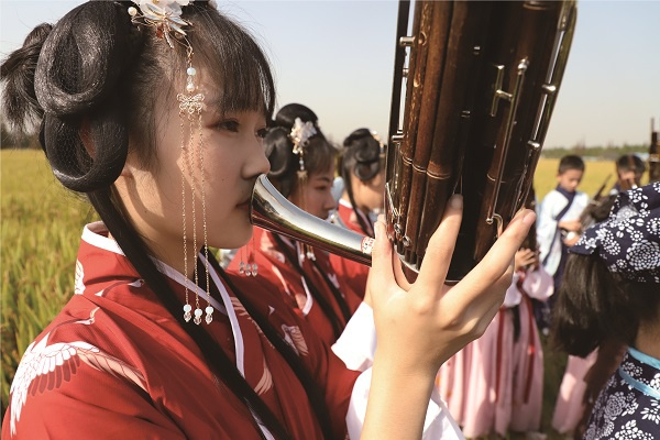 图说:学生们在吹奏古笙