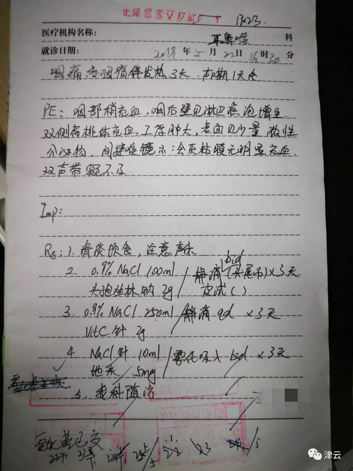 小鱼拿出了当天接诊医生手写的病历予以佐证。小鱼的病历本上写道:咽部稍充血,咽后壁见淋巴滤泡增生。双侧扁桃体充血,Ⅰ度肿大,表面见少量脓性分泌物,间接喉镜示:会厌黏膜无明显充血,双声带窥不及。