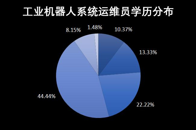 2、【学历分布】44.44%的工业机器人系统运维员是专科学历,1.48%为硕士研究生,45%的学历为大专及以下。工业机器人系统运维员就业门槛低。