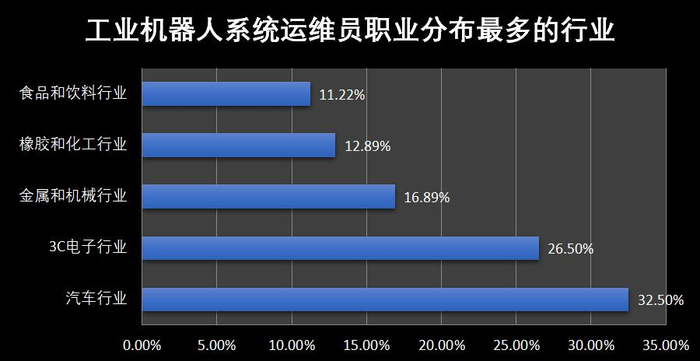 5、【职业分布】工业机器人系统运维员职业从业工作人员中32.5%是在汽车制造行业就职的,26.5%是在3C电子行业,16.89%是在金属和机械行业,12.89%是在橡胶和化工行业,11.22%是在食品和饮料行业就职,同时这些行业也是国内工业机器人应用最广泛制造行业。