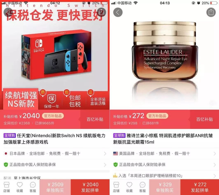 ▲任天堂Switch游戏机、雅诗兰黛小棕瓶等进口商品,在拼多多全球购上深受消费者喜爱