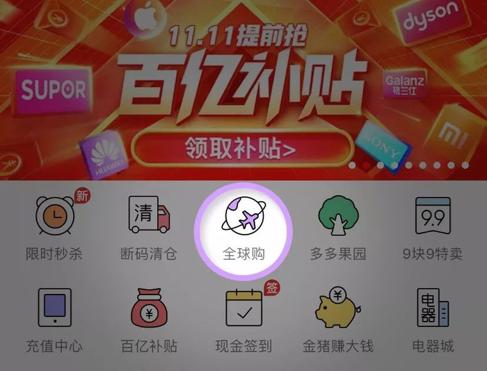 ▲拼多多的跨境电商业务全球购,目前位列拼多多APP一级入口