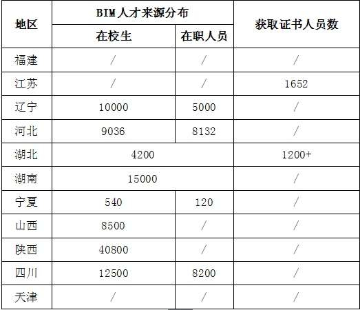 1、来源分布。11个省市提供的数据表明,BIM人才主要来源于在校学生,以及接受BIM相关培训的企业在岗人员,详见表所示。