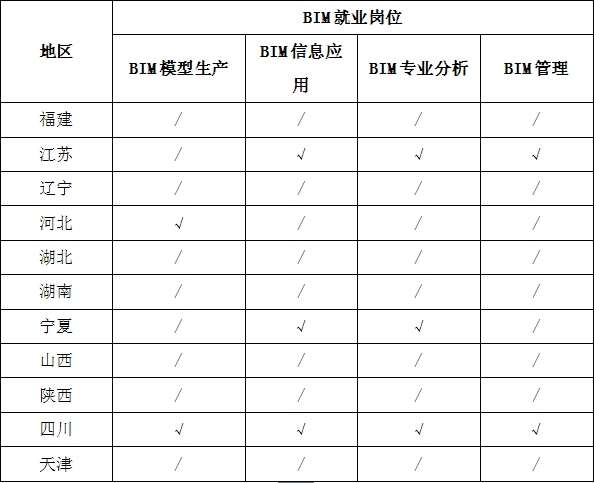 3、就业岗位分布。从11个省市的BIM就业岗位分布来看,不同地区的企业对BIM人才的岗位需求也各不相同,BIM技术应用发达的地区更需要能将BIM技术与生产过程融合的复合型人才,不局限于BIM建模工作,例如江苏省企业招聘的人员以BIM信息应用,BIM专业分析和BIM项目管理为主。
