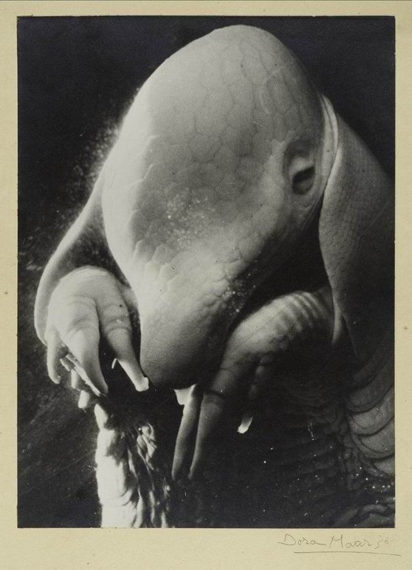 她用大画幅负片做的实验看起来非常现代,而她摄于1934年2月的巴黎街头抗议的照片则呼应了这座城市最近的动荡。她还拍摄了许多超现实主义运动的领军人物,包括伊洛亚德(Eluard)和画家列奥纳尔·菲尼(Leonor Fini),但最令人惊讶的超现实主义图像是《乌布》(Ubu, 1936),后来被确认为犰狳胎儿的特写,其名称取自阿尔弗雷德·贾(Alfred Jarry)的荒诞剧《乌布·罗伊》。画面中有一种仿佛来自外星的异样感,却又充满人性。