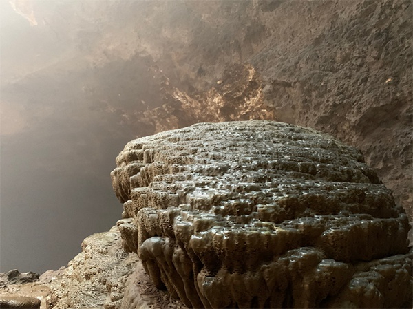阳光在狭小的洞口处汇聚成了一束白色的光,笔直地冲破黑暗,如瀑布一般倾泻下来。四周的一切都被“蒸腾”起的“水气”轻柔地笼罩了起来, 白茫茫的一片,既神秘又如童话幻境。如果仔细听,还能听到流水奔腾咆哮的声音,那其实是来自地下暗河强劲的水流。