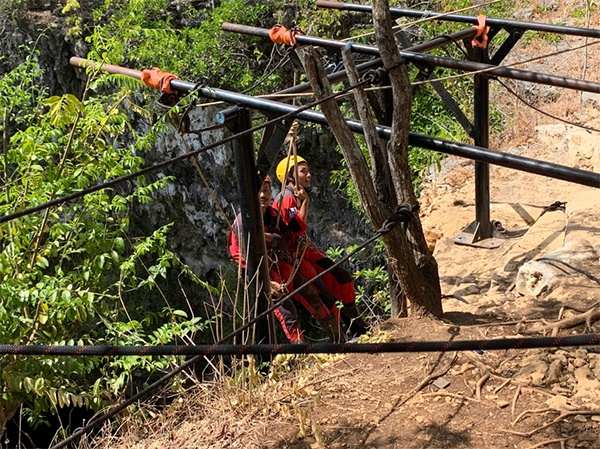 随着叫号开始,准备区的空气突然弥漫起一股紧张的气息。只见最前头的两名游客在工作人员指引下,移步来到了悬崖边,背朝天坑站立。两名工作人员熟练地用绳子在游客的腰间和背上穿梭,一头固定在安全带上,另一头固定在悬崖边搭建起来的滑轮支架上,等确定一切稳固后,工作人员示意游客慢慢地松开手脚。