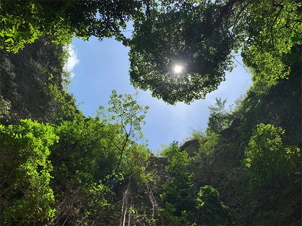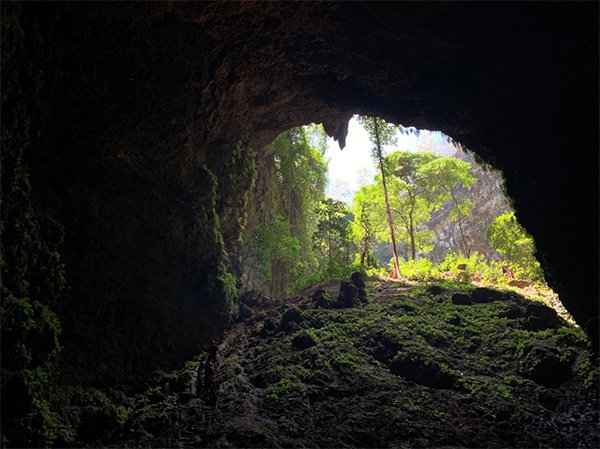 走入洞窟前,回头再望一眼中岜朗天坑里的“世外桃源”。