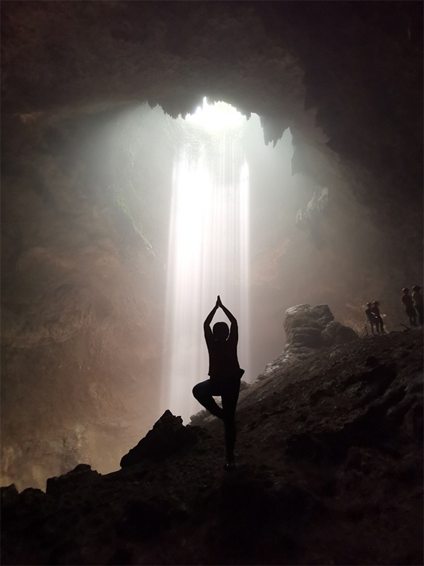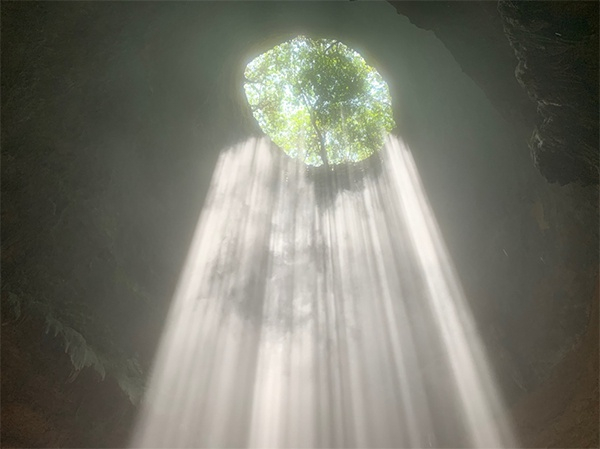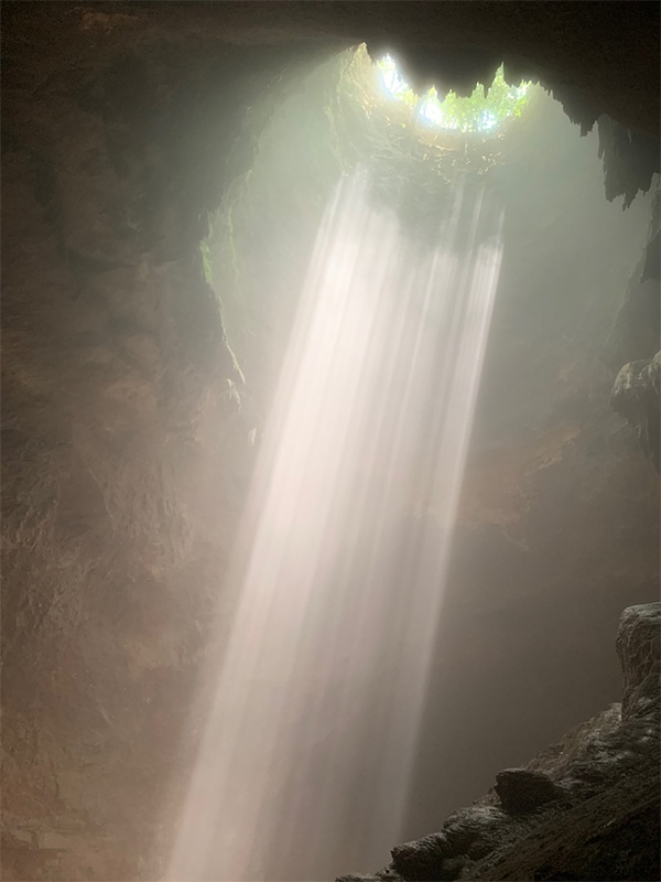 中岜朗天坑就是其中一个著名的天然垂直洞穴(在爪哇语中称为“luweng”),直径达五十米,深约六十米。据说天气好的时候,阳光会从天上倾泻下来,在黑暗的洞穴里形成一道洁白的光柱,十分梦幻,被当地人称为“上帝之光”。也正是这道光,吸引了我们不远万里前来“打卡”。