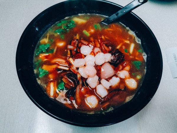 光看文字让人垂涎欲滴,可在奎元馆吃的那碗虾爆鳝面,并没给我留下什么印象,倒是社区里这家,虾爆鳝面端上桌,热气腾腾,油光四溢。先尝一口汤,鲜烫——温度是美味的必要条件,看来店老板深谙其道。虾爆鳝浇头,浓油赤酱,显然是猛火快炒出的,鳝片脆,虾仁嫩,混入面汤中,各自的鲜味也随之蔓延在汤水中。当然店家不会如文字记载中那般处理原料,可浇头炒得着实让人钦佩。