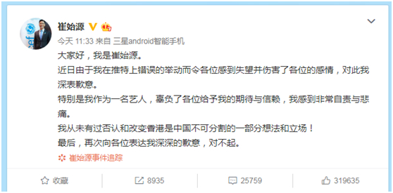 原标题:崔始源微博再道歉:从未否认香港是中国不可分割一部分