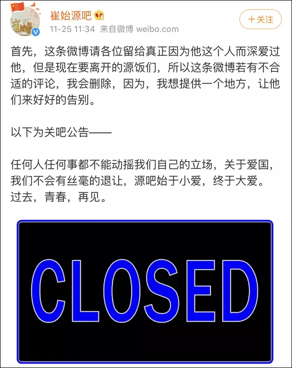 25日中午,百度崔始源吧官方微博@崔始源吧 宣布关吧,严肃表态“任何人任何事都不能动摇我们自己的立场,关于爱国,我们不会有丝毫的退让。”