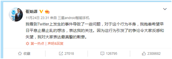 崔始源24日曾在微博上表示,自己抱着希望早日平息止暴止乱的想法,表达关注。因为这行为引发了的争论令大家反感和失望,对大家表达最真摯的歉意。