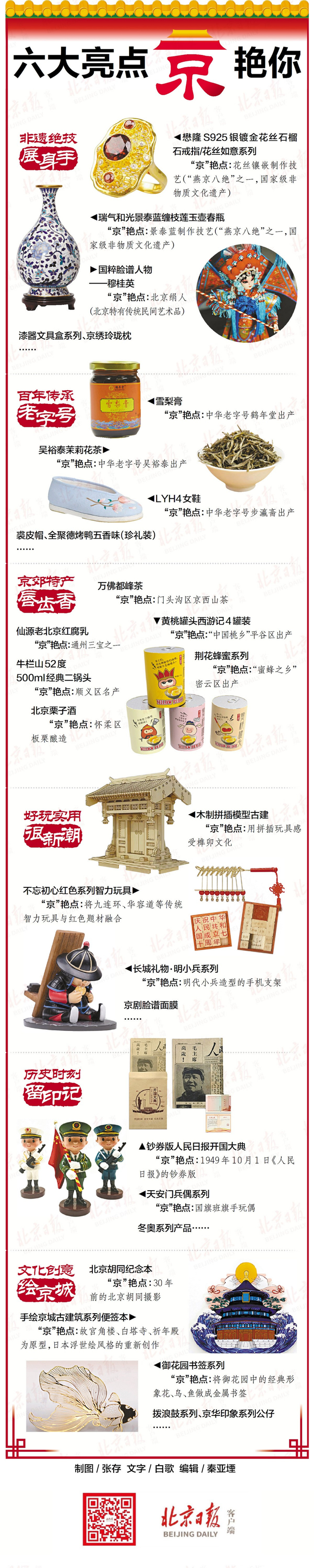 北京市文旅局资源开发处副处长王建介绍,“北京礼物”分为传统工艺品、地方特色商品、纪念衍生品、文化创意科技商品等四大类,体现古都文化、红色文化、京味文化和创新文化内涵。此前,“北京礼物”实行的是特许经营模式,种类相对单一。自从去年开始,“北京礼物”改为了认证模式,不少企业积极性被调动起来,申报的范围和品类都增加了。“只要在北京生产销售有北京特色的产品都可以申请认证,我们会依据相关标准进行筛选。”