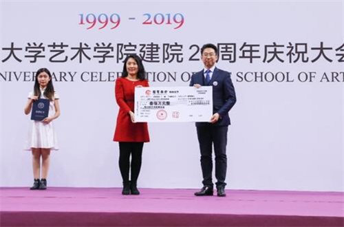 大会现场还举行了校友捐赠仪式。学院首届校友2000级绘画专业学生武志,代表斯玛特教育集团向中国人民大学教育基金会捐赠300万元,用于学院院庆活动及学院建设。中国人民大学教育基金会副秘书长王志成上台接受捐赠,中国人民大学党委副书记、纪委书记吴付来为武志颁发校董证书。2000级校友杜培俊向学院捐赠15万元。杜培俊在2000年入学时,曾获得学校助学贷款和奖学金,毕业后他一直铭记老师教诲,此次校庆他拿出个人积蓄表达感恩之情,希望尽自己的微薄之力,让爱的种子继续在人大校园传递。