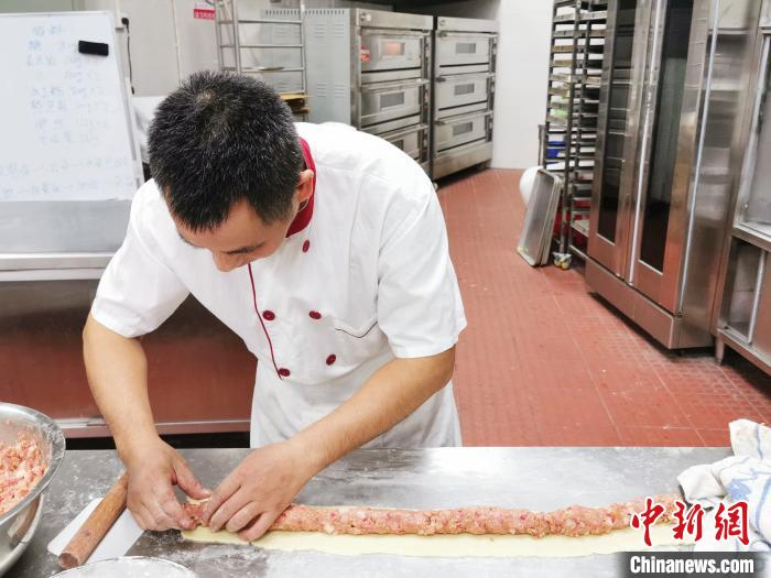 “传统鸡仔饼的外观不规则,仅需将用面粉、糖、糖胶和水调配好的粉皮切块擀成四五个手指宽的长条状,把冰肉(焯水后用酒和白糖腌制好的肥猪肉)、砂糖、洋葱、生姜、蒜头、南乳、盐、五香粉、胡椒粉、沙姜粉、油、酒、水、面粉、麦芽糖、花生、芝麻等按比例拌匀的馅料放到擀好的粉皮上,采用粉皮两边包裹馅料的方式,将馅料卷成长条圆柱状后,按饼的大小切出小剂子,翻过来馅心朝上,用掌心轻压成饼状。”广东厨艺技工学校面点教研组长兼粤菜师傅工程面点指导教师梅昔明介绍,有的师傅选用核桃仁、榄仁、瓜子仁等做馅料,做好的鸡仔饼抹上蛋液就可入炉烘焙,20分钟后就可出炉。