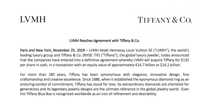 11月25日,全球最大奢侈品集团LVMH与美国奢侈品珠宝商蒂芙尼(Tiffany & Co)正式宣布,两家公司已达成最终协议,LVMH将以每股135美元的现金收购Tiffany,而最终此次股权交易的总价值或将达到162亿美元。